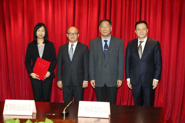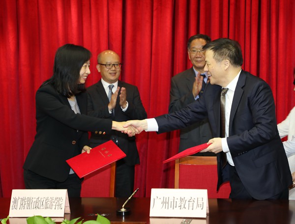 在广州市政府副秘书长张建华、澳门特别行政区高等教育局代局长曾冠雄的见证下,广州市教育局党组书记、局长樊群和澳门特别行政区旅游学院院长黄竹君签订了《广州市教育局与澳门特别行政区旅游学院战略合作协议》。签署活动由市教育局党组成员、主任督学谷忠鹏主持。