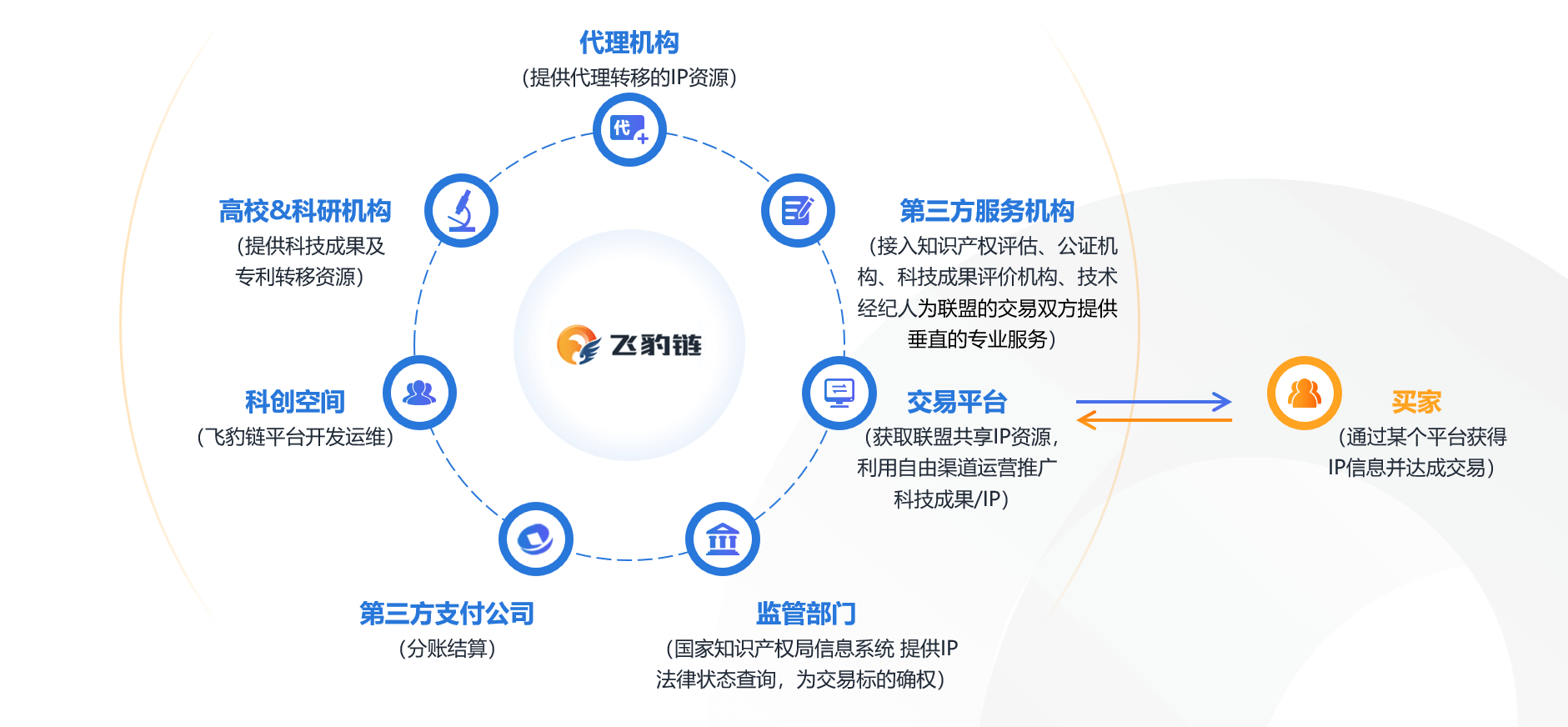飞豹链 (IP 交易联盟 )是广州科创空间信息科技有限公司基于区块链技术研发的,面向国内外知识产权运营机构、高校、科研院所开放的联盟链。是互联网+区块链的知识产权交易平台。飞豹链应用互联网技术解决了知识产权交易资源分散,应用区块链的智能合约实现多方交易结算,应用共识算法解决了交易平台与所有权人之间的信任。飞豹链第一批联盟成员试商用测试已完成,将于2018年12月正式商用。